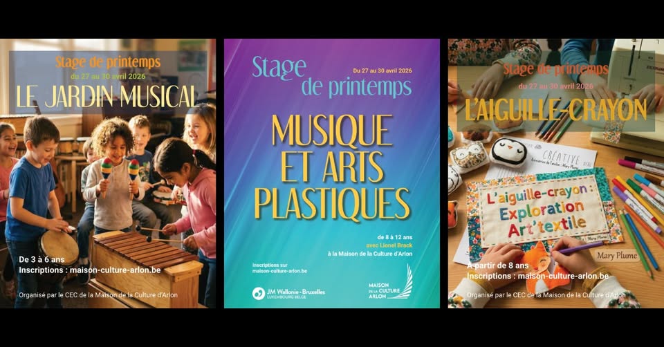 • 2026-04-27 09:00:00 2026-04-30 16:00:00 Europe/Paris Spring workshops at the MCA La Maison de la Culture and the Centre for Expression and Creativity are organizing three different workshops for the first week of the spring holidays: - For ages 3 to 6: The musical garden - For ages 8 to 12: Music and visual arts - From age 8: The Needle-Pencil: art textile exploration Parc des Expositions 1, 6700 Arlon, Belgium Maison de la Culture d'Arlon