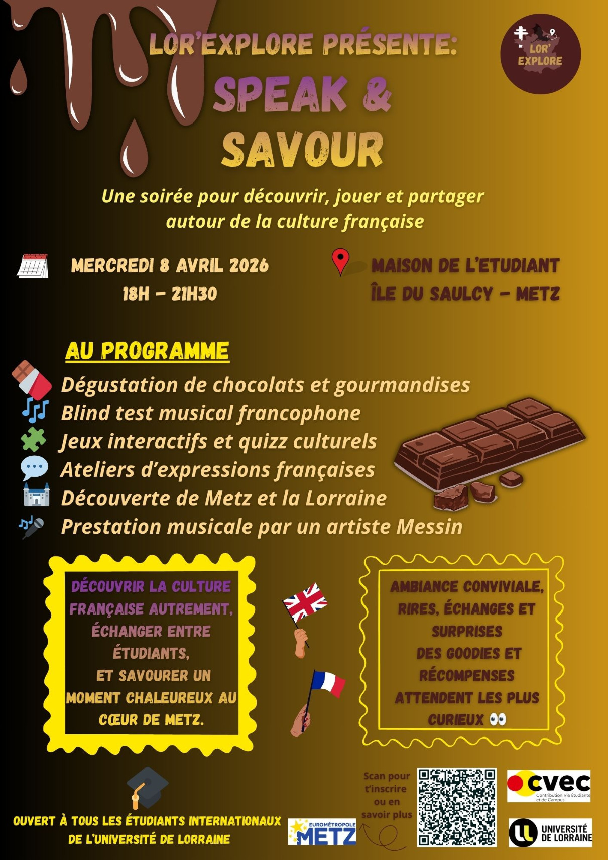 Lor'Explore Speak and Savor is a series of 6 free student evenings dedicated to discovering the cultural and gastronomic heritage of Metz and Lorraine through bilingual activities, tastings of local specialties, and meetings with musicians and local artisans. The main goal is to encourage integration, inclusion, friendliness, and exchanges between international and French students from all fields and campuses by highlighting regional richness.