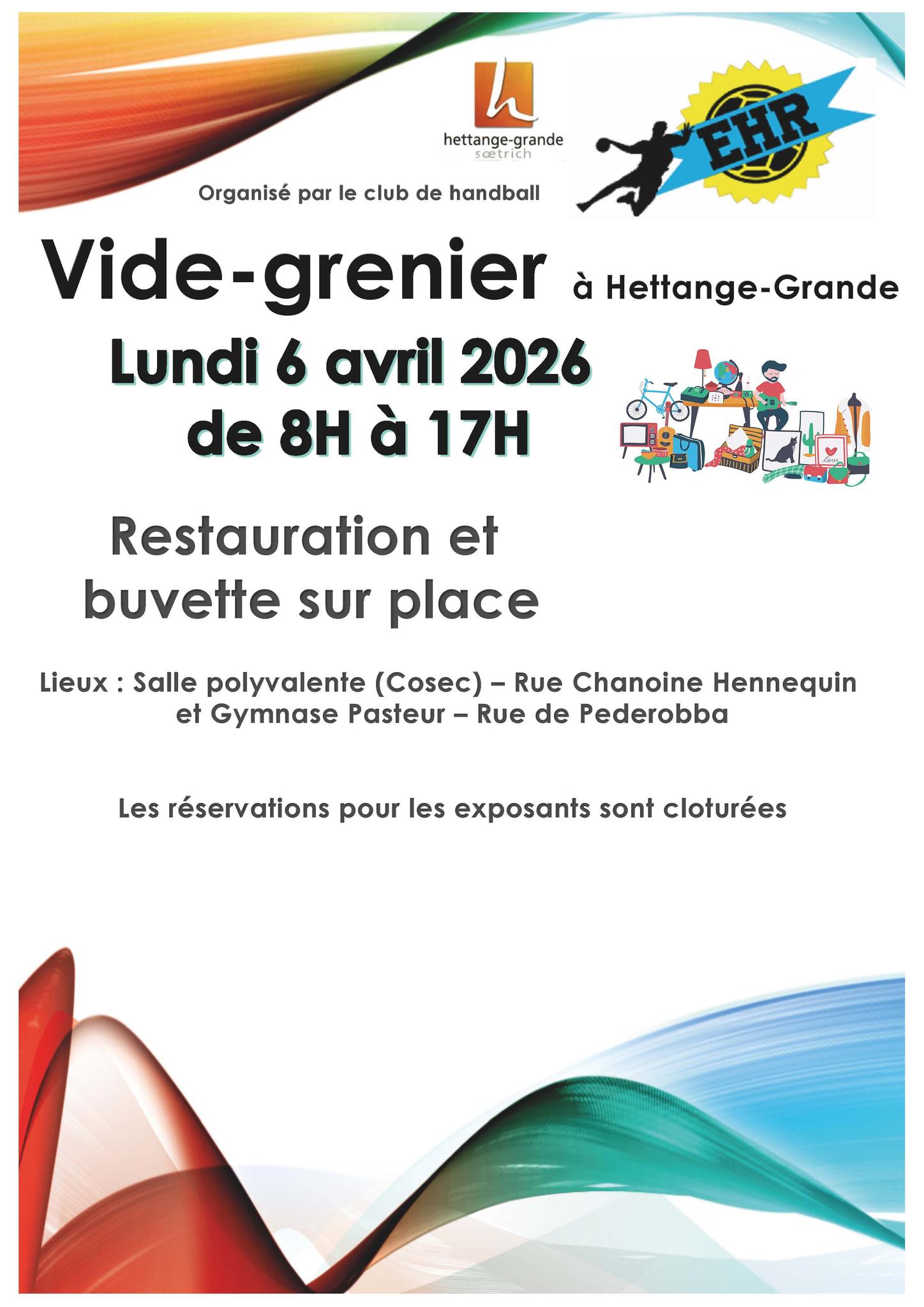 • 2026-04-06 2026-04-06 Europe/Paris Handball Club Garage Sale The Hettange-Grande Handball Club invites you to its big annual garage sale. Come hunt for treasures and enjoy a friendly moment with family or friends. 5 rue de Pédérobba Hettange-Grande 57330 FRANCE Pays Thionvillois Tourisme