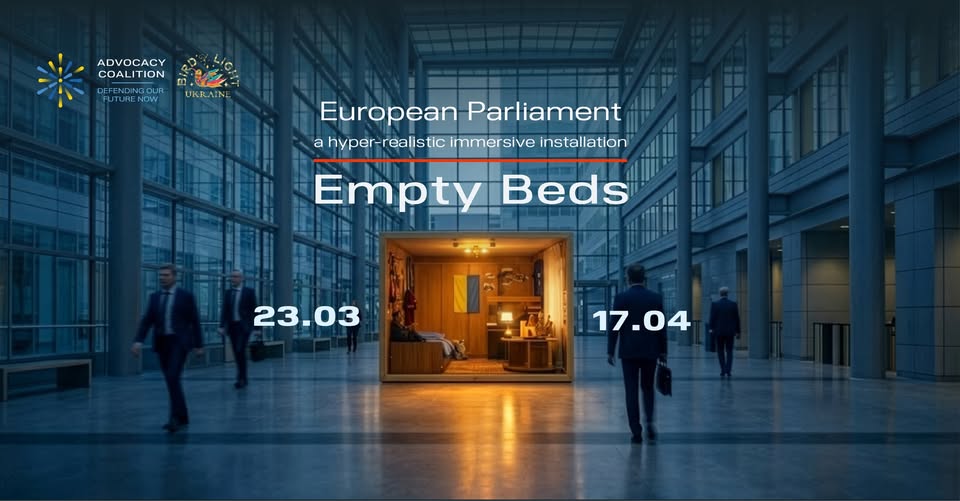 The installation recreates a child’s empty bedroom within the walls of European institutions, reminding us that behind every statistic there is a life, a family, and an empty bed still waiting.