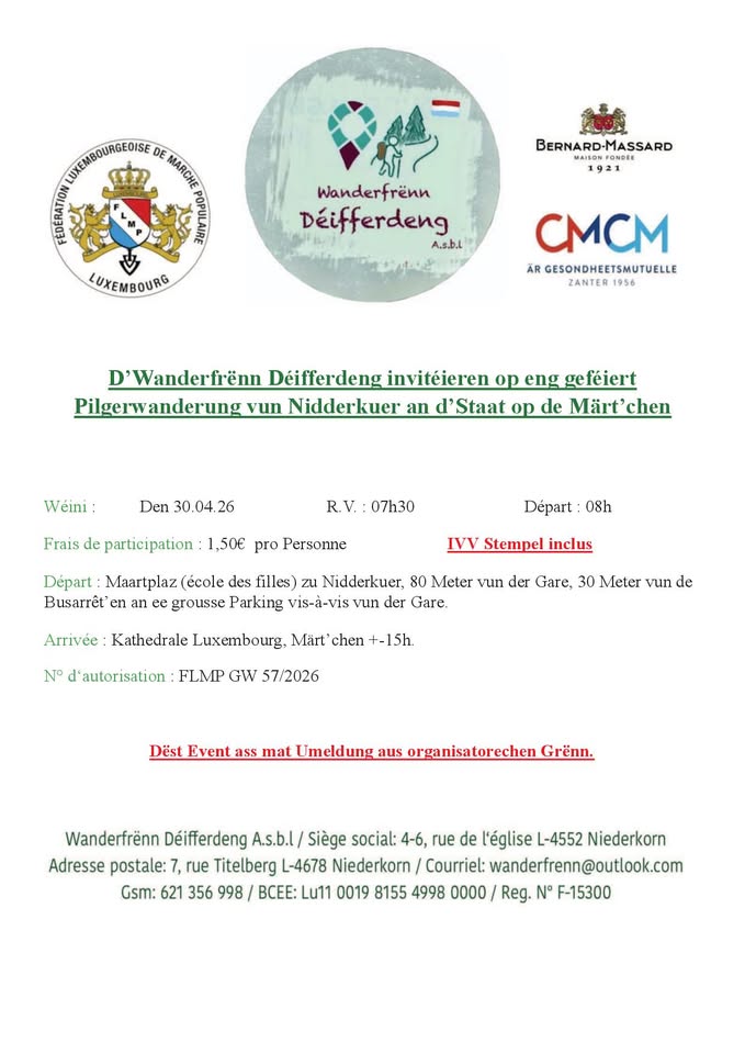 Wanderfrënn Déifferdeng invites you to a pilgrimage hike from Nidderkuer to Luxembourg City, ending at the cathedral. The route is 25 km long, passing through various terrains and beautiful nature. The march is intended to be enjoyable, not competitive. Participants can join later at Leudelange train station (for the last 8 km) or even later near the Dutch church (for those with walking difficulties). A break and refreshment are planned at Leudelange station.
