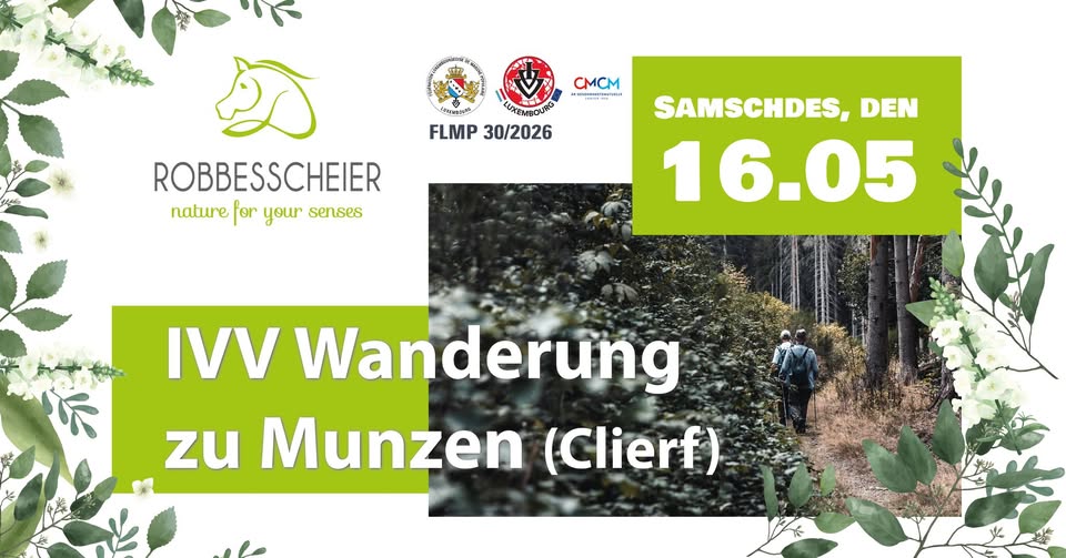 Walking event in Munzen (Clierf), starting and finishing at Robbesscheier. Several routes available: 6, 11, and 19 km.