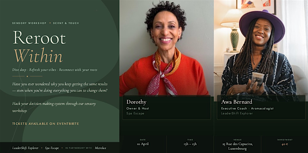 In partnership with Awa Bernard, founder of LeaderShift Explorer, and Dorothy, founder of Spa Escape, we invite you, in this immersive 75-minute experience, to explore change from the inside out.