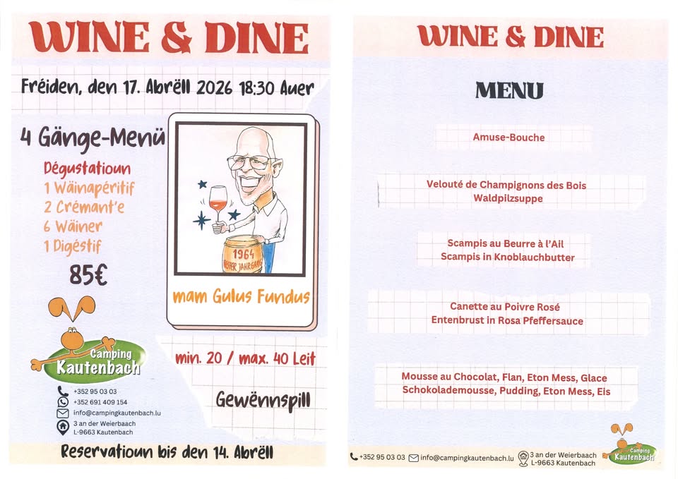 Reservation required before April 14th. Limited spots (min. 20 / max. 40). 4 courses, 2 glasses of crémant, 6 selected wines, digestif at the end. Location: Camping Kautenbach.
