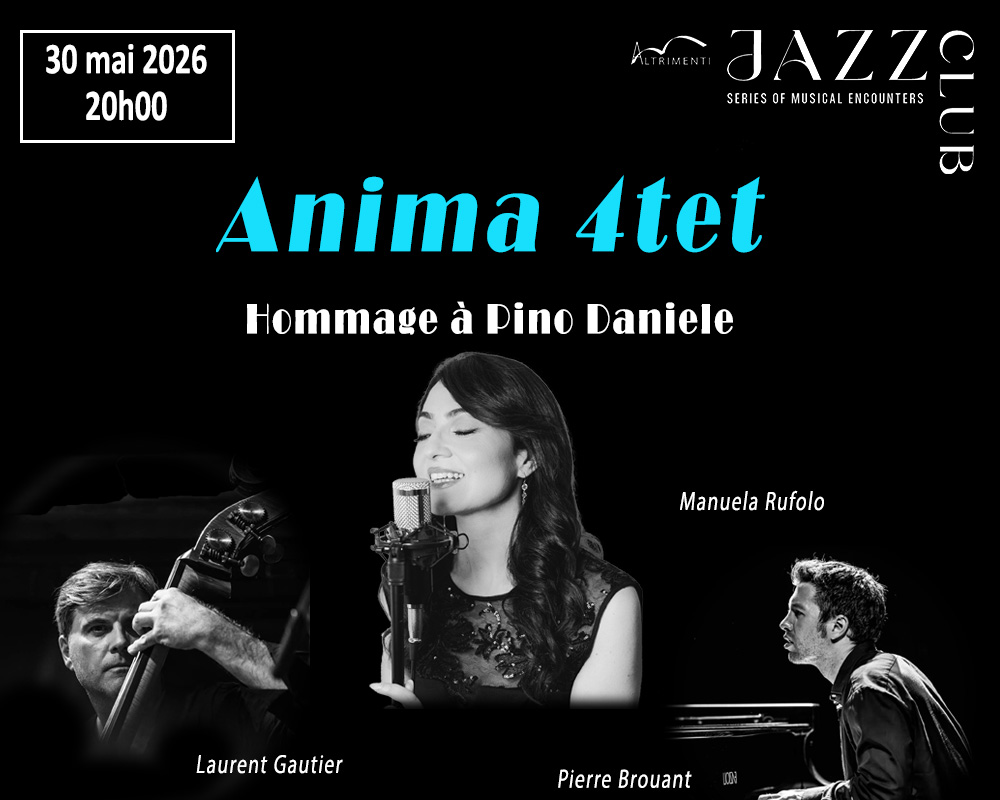 A heartfelt tribute to music that crosses cultures, generations, and time. The ANIMA project returns to the stage with a new ensemble to pay tribute to the world of Pino Daniele. Manuela Rufolo (vocals), Pierre Brouant (piano), and Gautier Laurent (double bass) explore the musical universe of Pino Daniele, blending blues, jazz, and Mediterranean traditions. This trio offers original arrangements and improvisations, providing a personal and contemporary interpretation of these timeless songs.