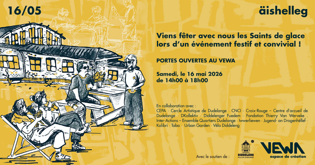 Come celebrate the 'Saints de glace' with us at a festive and friendly event! It's the perfect opportunity to meet the community behind the former changing room and wagon workshop: VEWA, a shared creative space for artists, craftspeople, and citizens – the cultural and associative heart of the future Neischmelz district. Join us with family or friends for a day of sharing, creativity, and discovery.