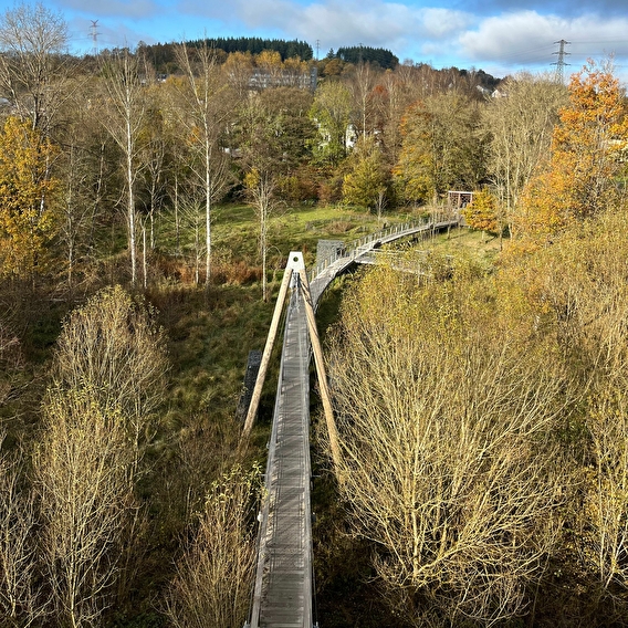 The route begins with the Passerelle des Oiseaux, 150 meters of wood suspended above the Sûre. Guaranteed shivers and breathtaking panoramas! Educational panels line the path to reveal all the secrets of the local wildlife. Next, head towards the Anlier Forest, one of Belgium's largest forests and designated a Natural Park: here, only the birdsong and the rays of the sun filtering through the pines accompany you.