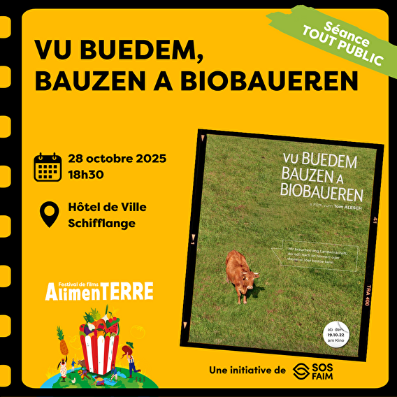 • 2025-10-28 18:30:00 2025-10-28 21:30:00 Europe/Paris Projection du film « Vu Buedem, Bauzen a Biobaueren » Venez découvrir le film documentaire « Vu Buedem, Bauzen a Biobaueren », une immersion captivante dans le Luxembourg. La projection sera suivie d’une animation participative proposée par SOS Faim & Biovereenegung, avec la présence du réalisateur Tom Alesch. PROGRAMME DE LA SOIRÉE 18h30 – Accueil des participant·e·s 19h00 – Projection du film 20h00 – Animation et catering Hôtel de Ville, Avenue de la Libération, 3850 Schifflange, Luxembourg Salle Grand-Duc Jean