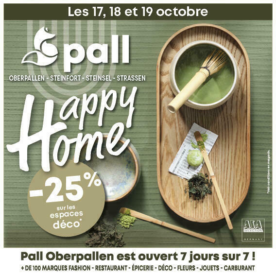 • 2025-10-17 08:00:00 2025-10-17 20:00:00 Europe/Paris Happy Home, le plein d'idées déco ! Du 17 au 19 octobre, un vent de fraîcheur va souffler sur ta décoration intérieure grâce à l'événement Happy Home au Pall Center ! Profite de -25% sur une grande sélection de l’espace déco* : des bougies pour une ambiance tamisée, un plaid tout doux, des assiettes colorées, un vase pour tes jolis fleurs... L'occasion parfaite pour craquer et apporter de la nouveauté dans ton cocon ! *voir sélection en magasin 2 Route d'Arlon, Oberpallen, Luxembourg Shopping Village Pall Center