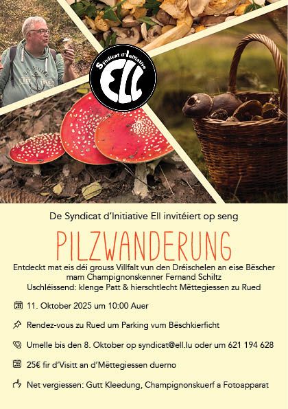 Le Syndicat d’Initiative Ell vous invite à une Balade aux Champignons le 11 octobre 2025, animée par Fernand Schiltz, un expert en champignons. Profitez de cette opportunité pour découvrir la richesse des champignons locaux dans les forêts environnantes. L’événement se conclura avec un déjeuner automnal.