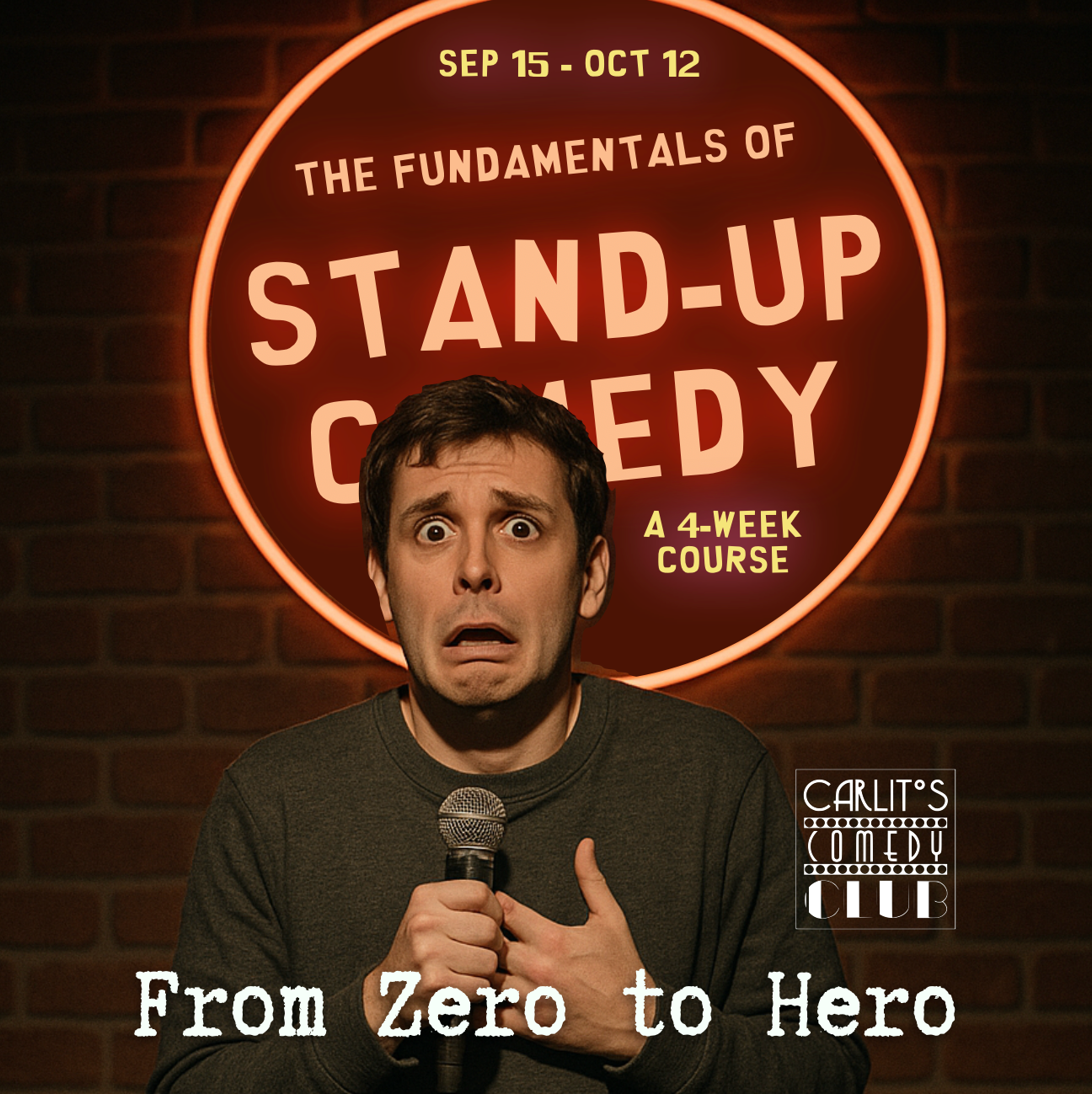 Les bases de la comédie stand-up : de zéro à héros. Un cours de 4 semaines par Carlitos. Durant ce cours, nous explorerons le processus de réalisation du stand-up, de l'écriture à la scène. Ce processus est universel et suivi par tous les comédiens, célèbres ou inconnus, consciemment ou non. Chaque séance dure 2 heures et comprend trois parties : théories comiques, exercices d'écriture et exercices de performance. À la fin du cours, vous serez en mesure d'identifier les éléments fondamentaux de la comédie stand-up et de les appliquer sur scène devant un public en direct.
