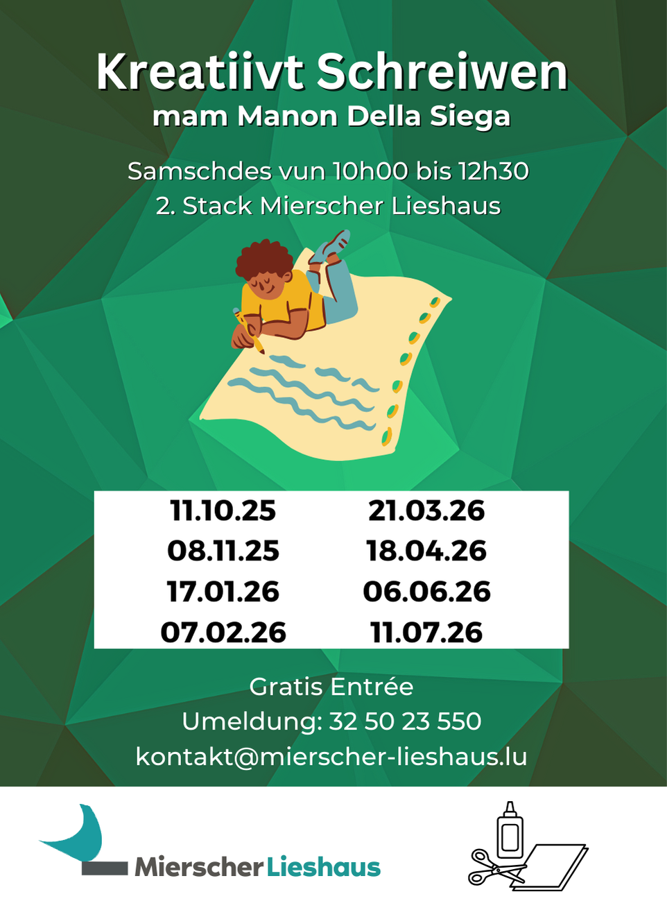 Alors rejoignez-nous pour la prochaine saison de merveilleux ateliers d'écriture créative au mierscherlieshaus qui seront encore plus captivants et amusants que les saisons précédentes.
