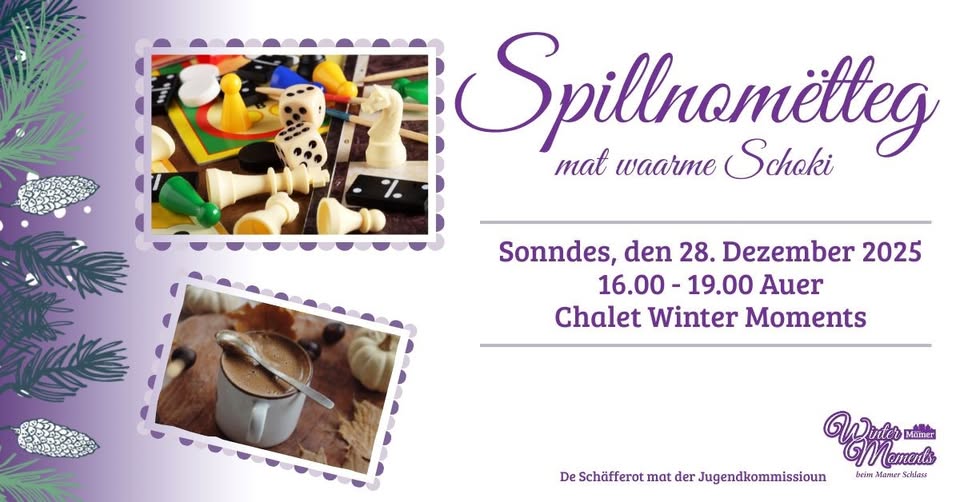 Rejoignez-nous le dimanche 28 décembre 2025, de 16h00 à 19h00, pour une après-midi conviviale au chalet des Winter Moments à Mamer. Profitez de jeux de société et d'un bon chocolat chaud. Des boissons et collations seront disponibles. Apportez vos jeux ou participez simplement sur place. Tous les âges sont les bienvenus. Enfants sous la supervision d'adultes.