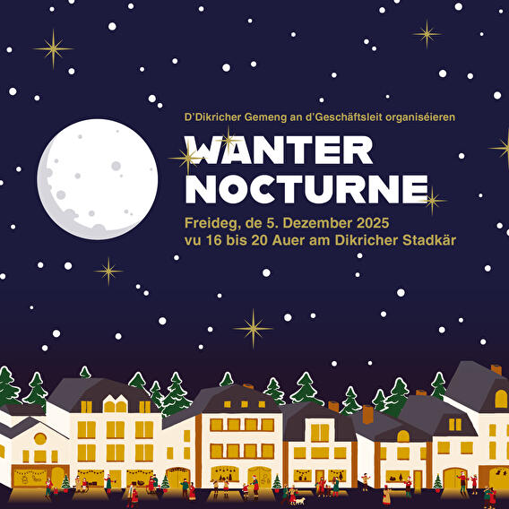 La commune et les commerçants de Diekirch t’invitent à la Nocturne d’hiver le vendredi 5 décembre dans tout le centre-ville. Viens profiter d’une soirée animée avec ateliers, dégustations, réductions et ambiance festive dans les magasins participants.