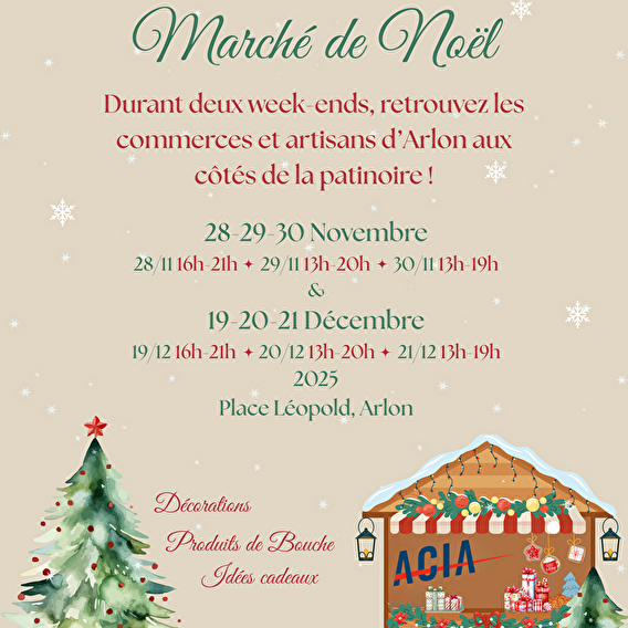 • 2025-11-28 2025-11-30 Europe/Paris Marché de Noël de l’ACIA Vous l’attendiez… et ça y est, pour la première fois, les commerçants et artisans d’Arlon vous donnent rendez-vous Place Léopold, dans de charmants chalets en bois installés aux côtés de la patinoire. Une édition féerique organisée par l’ACIA (Association Commerciale et Industrielle d’Arlon) ! Au programme : Pendant deux week-ends festifs, venez flâner, dénicher des décorations de Noël, trouver des cadeaux originaux ou savourer des produits gourmands à déguster sur place, à emporter ou à offrir. Dates : 28, 29 et 30 novembre 2025 19, 20 et 21 décembre 2025 Horaires : Vendredi 28/11 & 19/12 : 16h – 21h Samedi 29/11 & 20/12 : 13h – 20h Dimanche 30/11 & 21/12 : 13h – 19h Le secteur Horeca prolongera l’ambiance jusqu’à minuit ! Commerçants et artisans présents : 28-30 novembre : Artisphère Boutique d’Artisans, Atelier Cadre & Plus, Brasserie d’Arlon Coopérative, Douceurs Royales, Gompel Bar, In-Game Arlon, Insomnia/Cocoon, Le BOA Arlon, Lilalou Créations, Twins Brasserie, U.S. Coffee 19-21 décembre : Artisphère Boutique d’Artisans, Douceurs Royales, Gompel Bar, In-Game Arlon, Insomnia/Cocoon, Le BOA Arlon, Lilalou Créations, Matryx 3D, Twins Brasserie, U.S. Coffee Et ce n’est pas tout ! Participez au Concours Passeport vers Noël et tentez de gagner des lots offerts par les commerçants et l’ACIA ! Comment ça marche ? Retirez votre Passeport vers Noël dans les commerces participants ou sur le Marché. Pour tout achat dans un commerce d’Arlon, recevez un cachet. Remplissez votre passeport avec 3 cachets différents, remettez-le à un des lutins de l’ACIA et faites tourner la roue de la chance. Recevez un billet pour le tirage final 2025 et tentez de gagner des chèques cadeau ! Venez partager un moment féerique, dénicher le cadeau parfait et savourer la magie de Noël en famille ou entre amis ! Place Léopold, Arlon, Belgique Association Commerciale et Industrielle d’Arlon (ACIA)