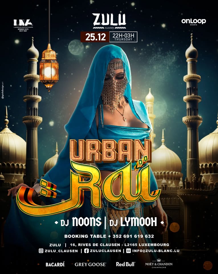 Venez vibrer au rythme de notre soirée Urban Raï, un savoureux mélange entre sons raï modernes et influences urbaines. DJ en line-up : DJ Noons, DJ Lymooh.
