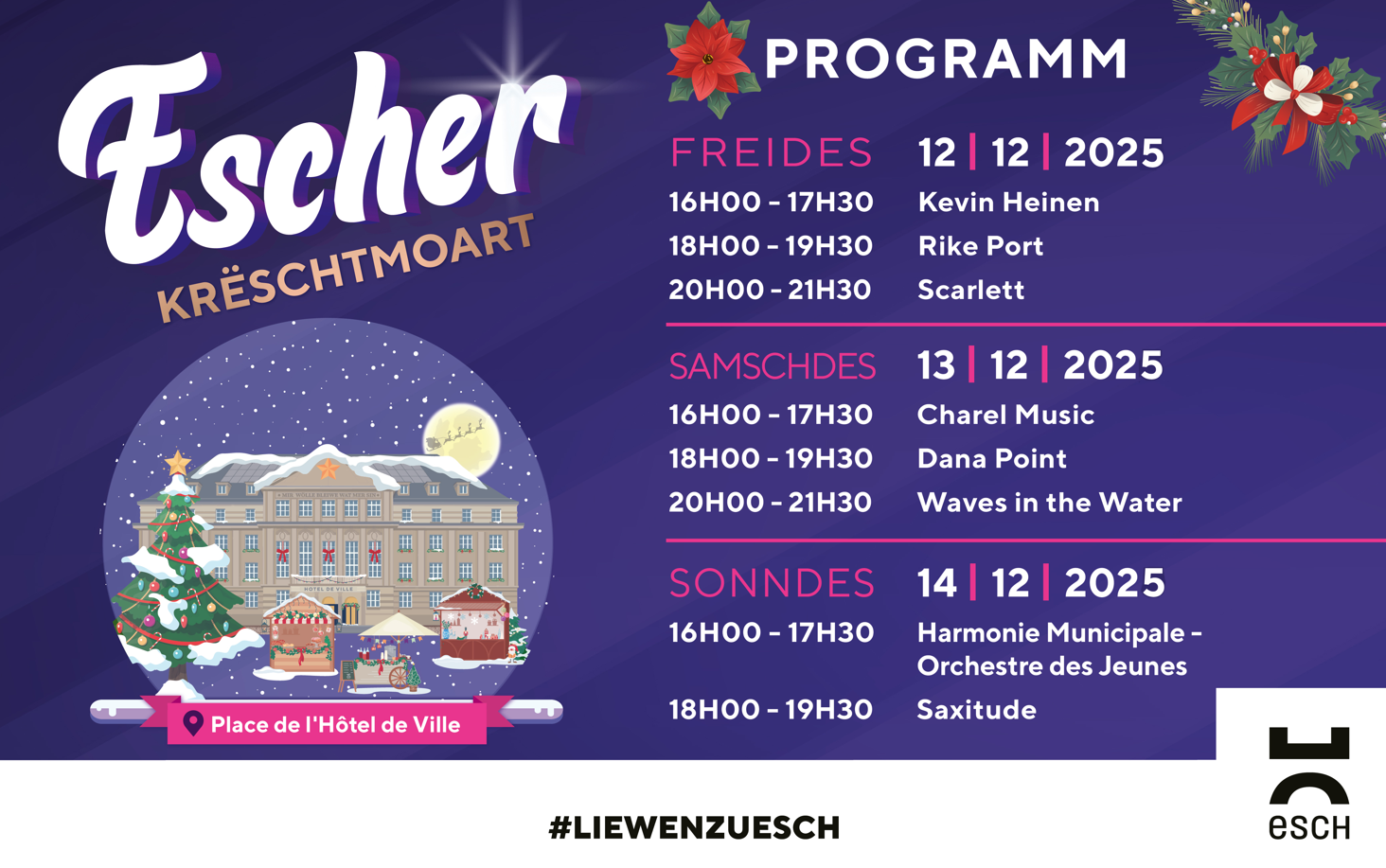 • 2025-12-14 16:00:00 2025-12-14 19:30:00 Europe/Paris Marché de Noël à Esch Noël arrive à Esch : chaleur, lumières et gourmandises ! Découvrez les 24 stands gourmands et artisanaux du marché et laissez-vous emporter, chaque vendredi, samedi et dimanche, par les concerts et animations sur la scène principale. 16:00 – 17:30 Harmonie Municipale – Orchestre des Jeunes 18:00 – 19:30 Saxitude Pl. de l'Hotel de Ville, 4083 Esch-sur-Alzette, Luxembourg Ville d'Esch