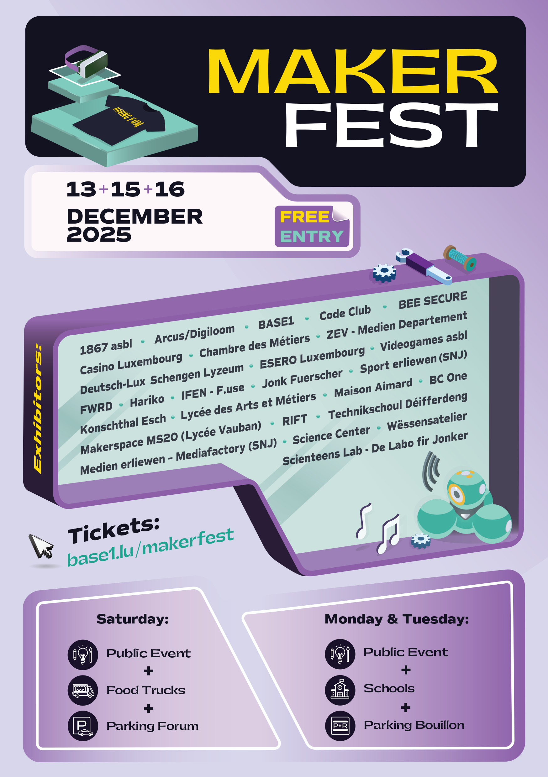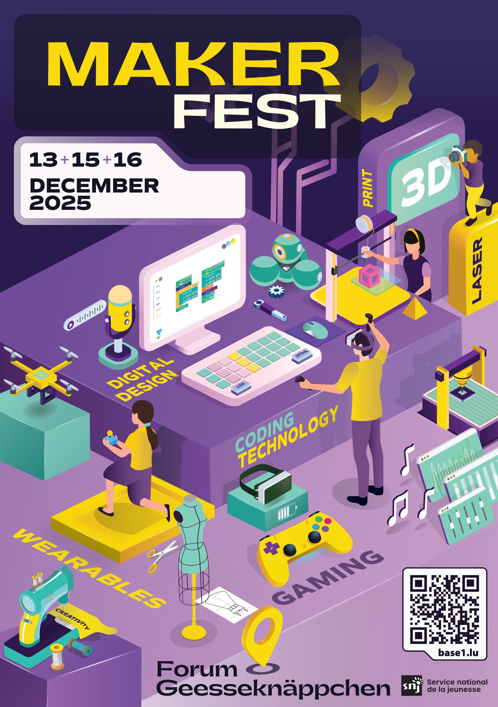 • 2025-12-15 10:00:00 2025-12-15 11:00:00 Europe/Paris Makerfest 2025 Le Makerfest est un événement qui met en avant la créativité, les nouvelles technologies, mais aussi l’esprit d’entreprise chez les enfants et les jeunes. Design, modélisation 3D, programmation, musique, couture, menuiserie,… les visiteurs pourront apprendre et explorer des nouvelles techniques dans des domaines très variés ! Des activités adaptées aux enfants à partir de 8 ans, mais aussi des activités pour les jeunes et jeunes adultes seront proposées. Forum Geesseknäppchen, Boulevard Pierre Dupong, Hollerich, Luxembourg Forum Geesseknäppchen