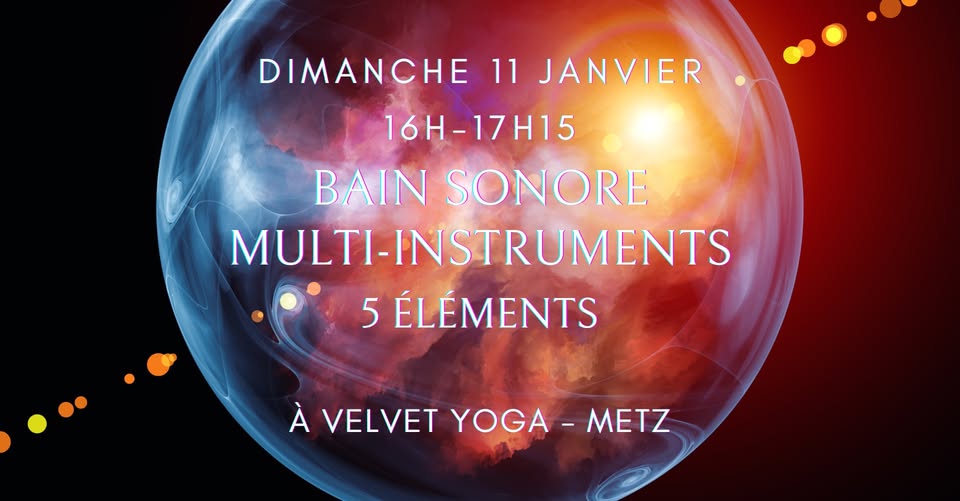 • 2026-01-11 16:00:00 2026-01-11 17:15:00 Europe/Paris Bain sonore Bain sonore multi-instruments "5 Éléments", une véritable immersion dans le son procurant une expérience harmonisante pour le corps et l'esprit. Velvet Yoga, Rue Grégoire de Tours, Metz, France HappyMetz