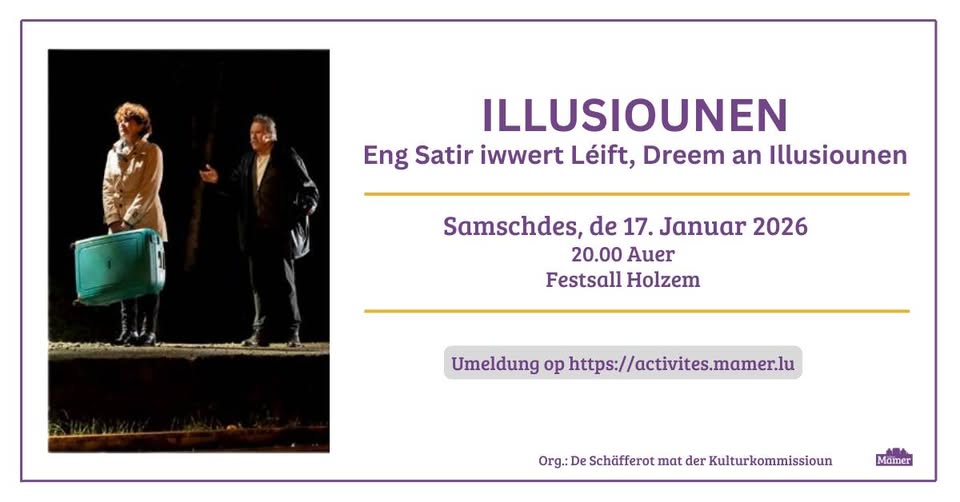 • 2026-01-17 20:00:00 2026-01-17 22:00:00 Europe/Paris Illusiounen, une satire sur l'amour, les rêves et les illusions Le Collège échevinal et la Commission des Affaires Culturelles invitent à une soirée exceptionnelle ! « Illusiounen », une satire luxembourgeoise à la fois émotionnelle et humoristique sur l’amour ❤️, les rêves 🌙 et les illusions ✨, avec des chansons de Josy Christen. La pièce raconte l’histoire d’une femme qui quitte son mari et montre comment tous deux traversent leurs émotions : colère, nostalgie, grands espoirs. Un mélange subtil de satire, d’humour et de moments de réflexion. 5 Route de Garnich, L-8277 Holzem, Luxembourg Gemeng Mamer