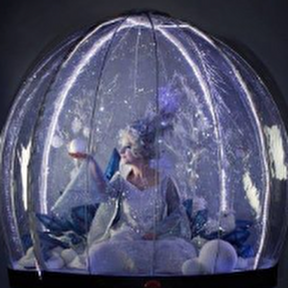 Au cœur d’une immense boule scintillante, un personnage féminin enchanteur vous invite à un voyage féerique. Ses gestes gracieux font tourbillonner la neige, ses mots murmurés éveillent les rêves. Autour d’elle, la lumière danse, le temps s’arrête et le merveilleux s’installe, le temps d’une déambulation pleine de poésie.