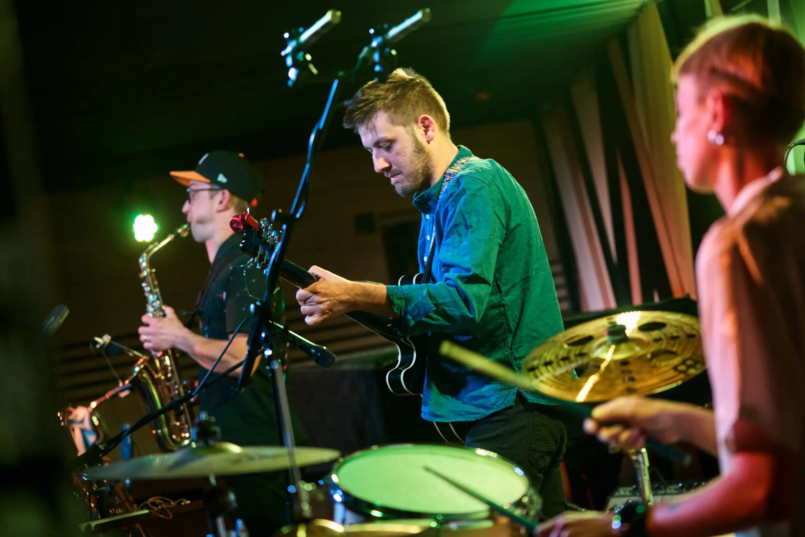 Une fille, deux gars. Désobéissants et enthousiastes. La première tape sur des fûts – et ça lui va bien. Les deux autres jouent du sax et de la guitare baryton, accompagnés de nombreux effets. Ce trio de jazz, punk et internationaliste s'inspire de l'Éthiopie de The Ex et Getatchew Mekuria, ainsi que des Dead Kennedys, Jaimie Branch et les Lounge Lizards. Ils créent des formules musicales imprégnées de lyrisme mandingue et de saillies électriques. Accompagnés par le dispositif Propulsion/LEAD avec le soutien de neimënster, leur présence scénique est libre et instinctive. Avec un EP enregistré en 2023 à Sainte-Marie-aux-Mines et sélectionné pour Jazz Migration #10, ils ont marqué les esprits. [Na] est une formation originale marquant leur nom entre crochets, mais ce qui compte vraiment, c'est leur musique.