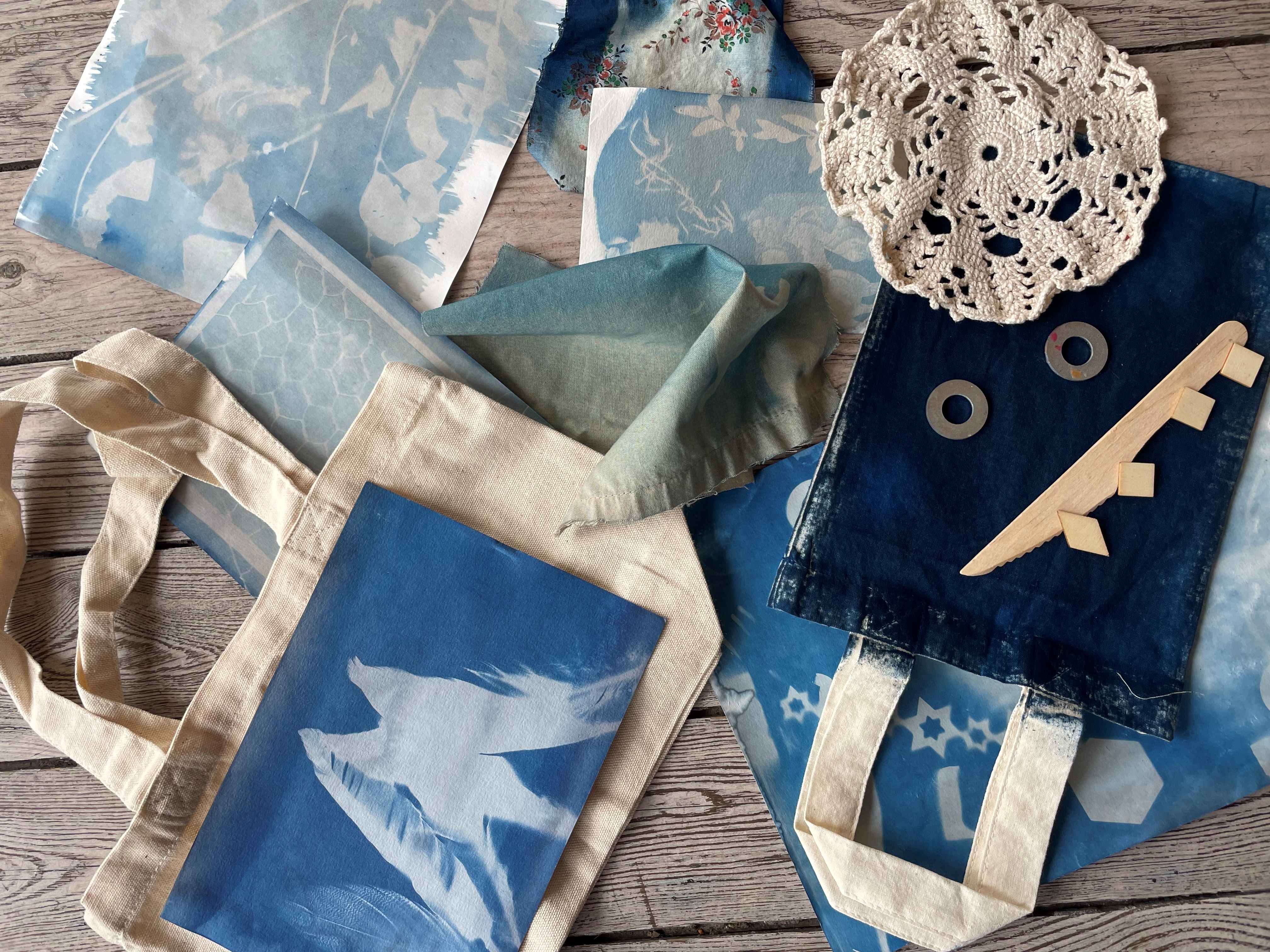Dans le cadre de l'exposition « AT », les enfants sont invités à concevoir et personnaliser leur propre création portable. À l'aide d'une variété d'objets, de textures et de formes, ils composent des images sur un tissu traité au cyanotype. À la fin de l'atelier, chaque enfant aura transformé son tissu en objet artistique portable à emporter chez soi.