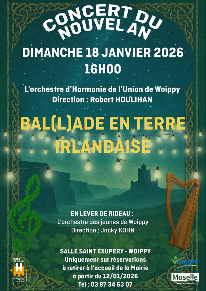 Traditionnel concert de la Nouvelle Année proposé par la Ville de Woippy et l'Union de Woippy. Le thème proposé cette année sera l'Irlande. Pour l'occasion, c'est le chef Irlandais Robert Houlihan qui sera à la baguette.