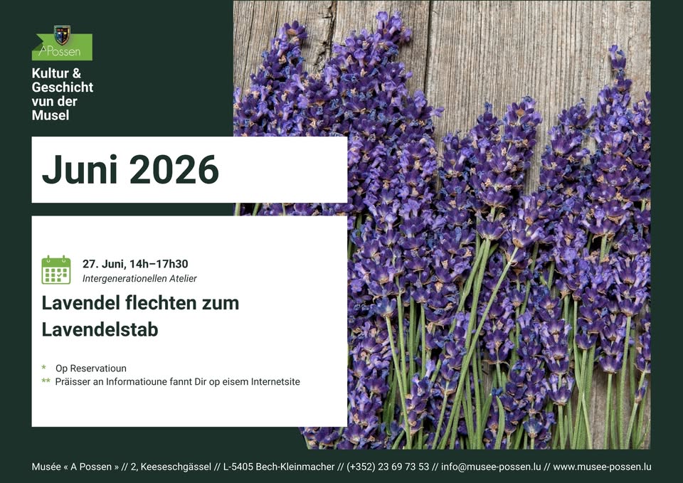 • 2026-06-27 14:00:00 2026-06-27 17:30:00 Europe/Paris Tressage de lavande en bâton de lavande À partir de juin, la lavande fleurit et embaume à nouveau de nombreux jardins… Le 27 juin, aux côtés de notre médiatrice, petits et grands pourront s’essayer au tressage de la lavande lors d’un atelier intergénérationnel (les enfants doivent être accompagnés d’un adulte). Avec un peu de dextérité et des rubans colorés, la lavande se transforme en bâton de lavande – une petite décoration qui est non seulement jolie, mais qui sent également très bon ! Une petite collation avec une boisson et une gourmandise sera également offerte lors de cet atelier. 2, Keeseschgaessel, 5404 Bech-Kleinmacher, Luxembourg Musée A Possen
