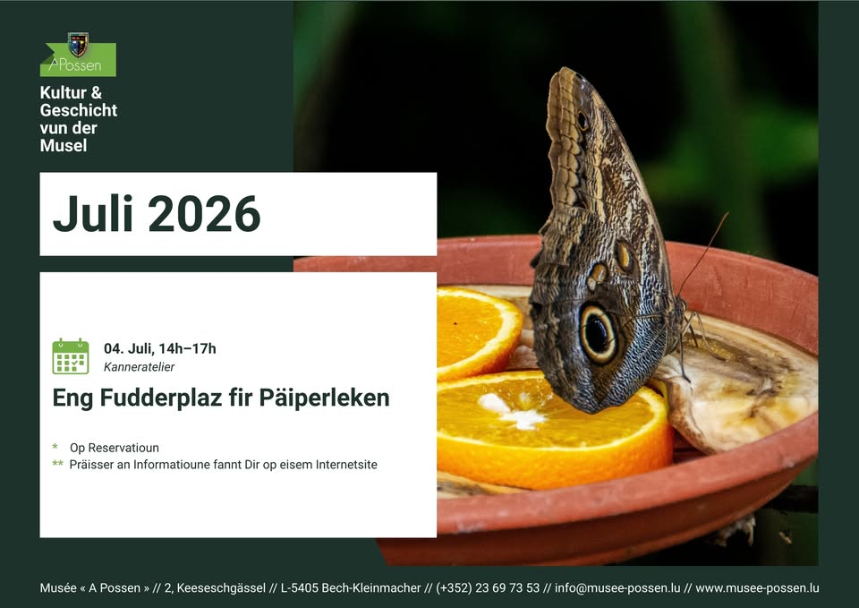 En été, les papillons virevoltent dans les airs avec leurs belles couleurs... Lors d’un atelier créatif pour enfants de 6 à 12 ans, le Musée « A Possen » invite les enfants à fabriquer un point de nourrissage pour papillons. Une technique artisanale traditionnelle sera utilisée : le macramé ! Accompagnés de la médiatrice, les enfants réaliseront deux créations différentes avec une petite assiette en terre cuite contenant de la nourriture adaptée. Un atelier qui allie artisanat traditionnel et démarche durable.