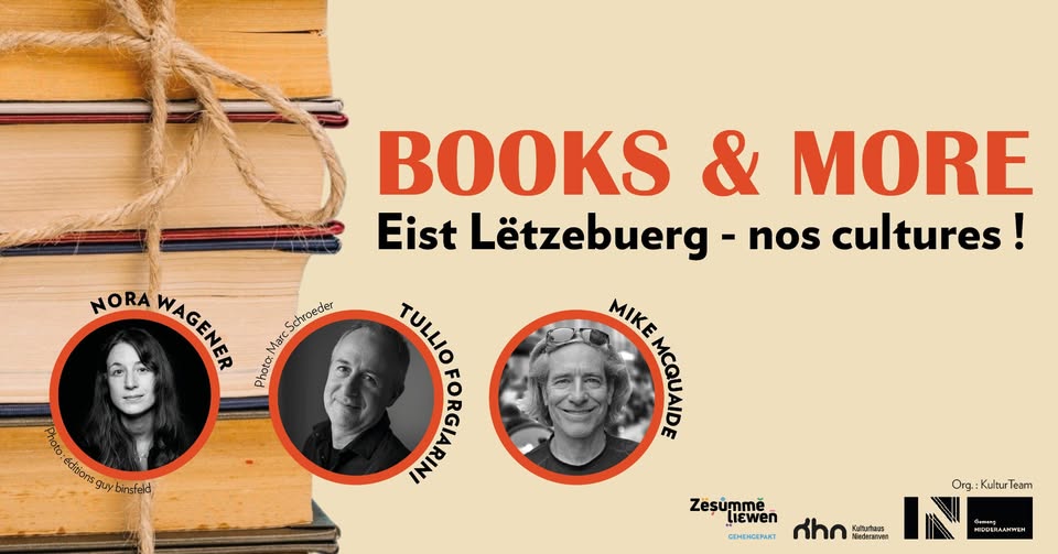 Participez à une rencontre littéraire exceptionnelle avec Mike McQuaide, Nora Wagener et Tullio Forgiarini, trois auteur·e·s liés au Luxembourg, qui explorent ce lien de différentes manières et dans divers contextes à travers leurs œuvres. Leurs livres reflètent la richesse et la diversité de la culture luxembourgeoise.