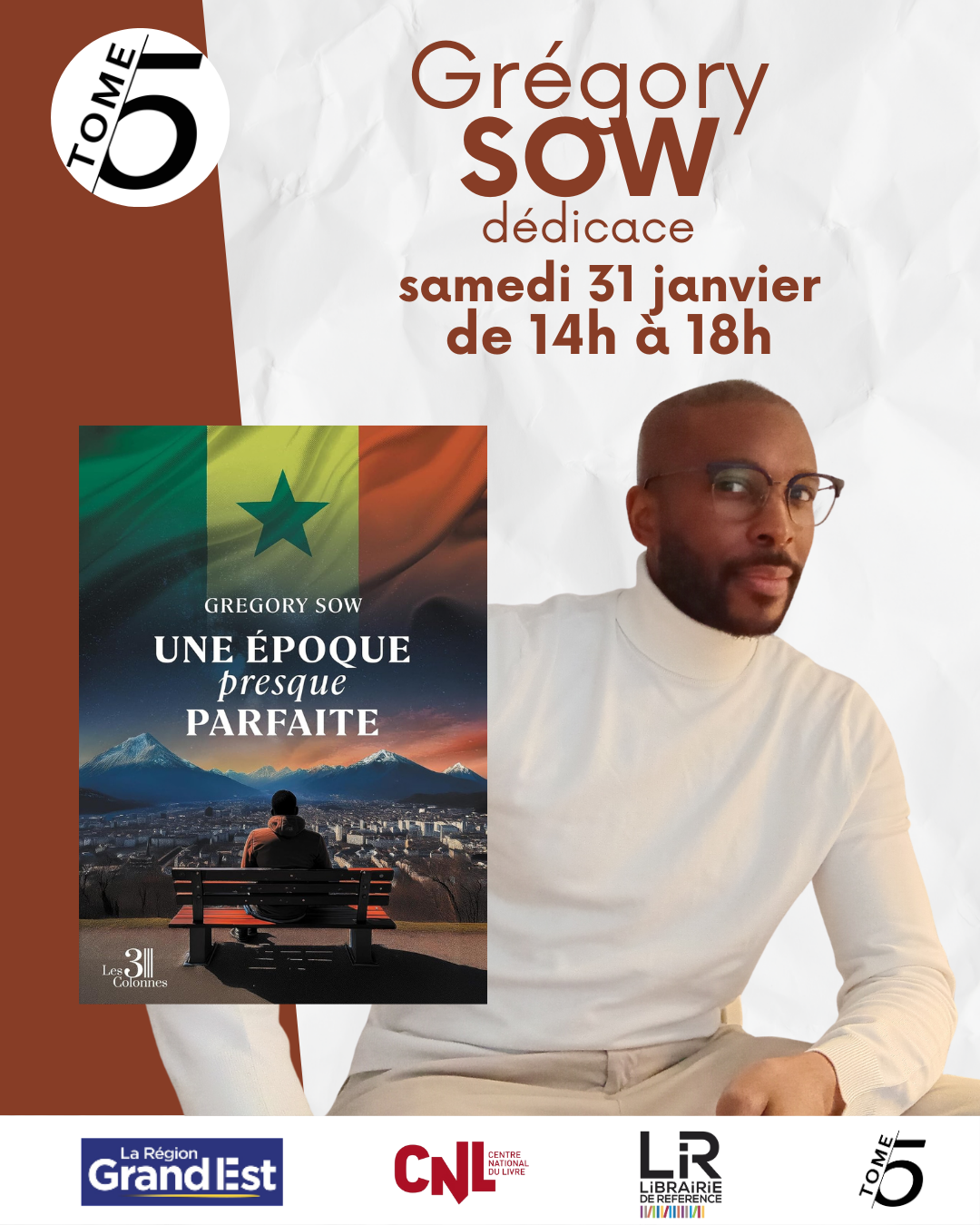 • 2026-01-31 14:00:00 2026-01-31 15:00:00 Europe/Paris Dédicace Grégory Sow Nous recevons à la librairie Gregory Sow pour qu'il nous présente son livre « Une époque presque parfaite ». Un récit vibrant sur l'identité, le courage face à l'adversité et la quête de sens. Ce roman captivant explore la complexité des liens familiaux et la force de l'exil, tout en célébrant la résilience et la renaissance. Une œuvre lumineuse qui touche au cœur de l'expérience humaine. Passionné de littérature et d'écriture... 46 Rue de Paris, 57100 Thionville, France Pays Thionvillois Tourisme