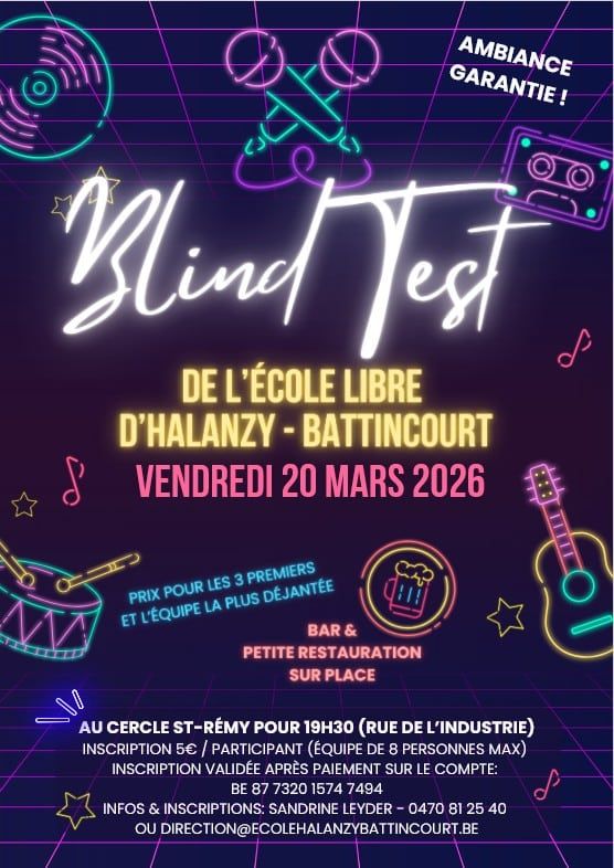 L'école libre Halanzy-Rachecourt organise son blind test le 20 mars 2026 au cercle Saint-Rémy à Halanzy.