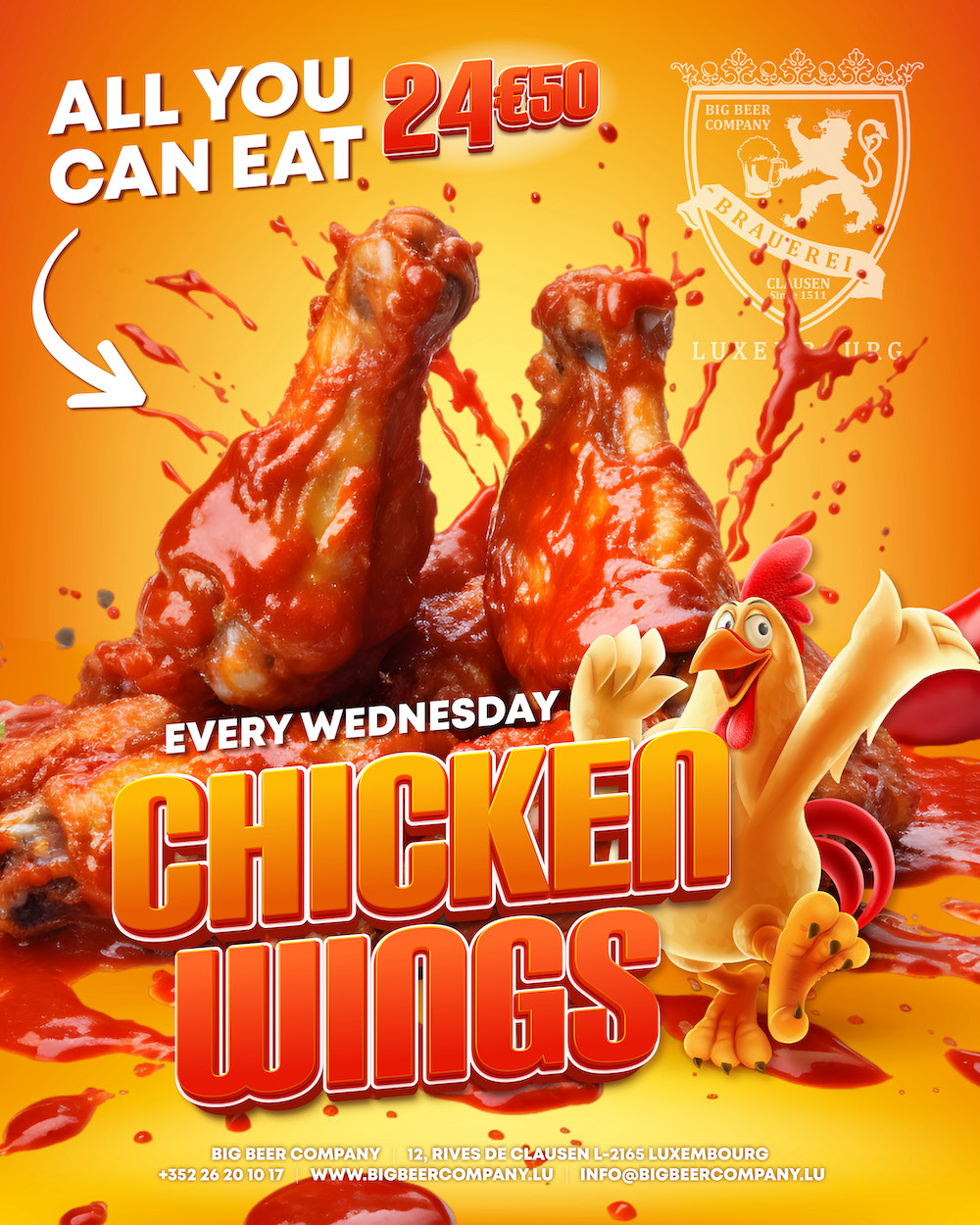 Rejoignez-nous tous les mercredis pour des ailes de poulet à volonté pour seulement 24,50 € !