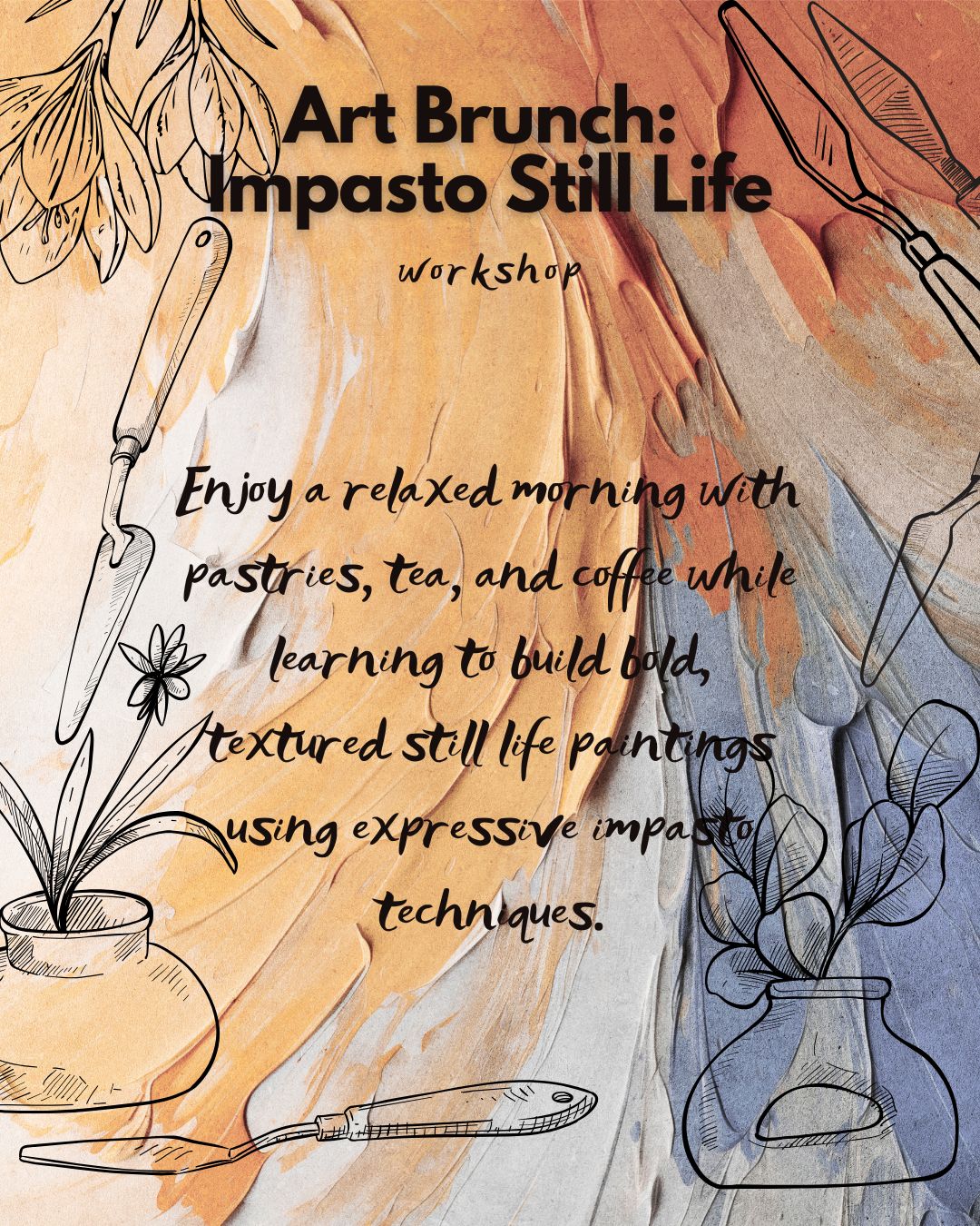 Détendez-vous un samedi matin autour de viennoiseries, de thé et de café tout en explorant l'univers expressif de la peinture de nature morte en impasto. Dans cet atelier convivial animé par l'artiste Alvira Ferreira, vous peindrez d'après de magnifiques natures mortes composées de fruits de saison, de fleurs et de céramiques, en utilisant cette fois-ci de la peinture à l'huile et des couteaux à palette pour créer une texture riche et de la profondeur.
