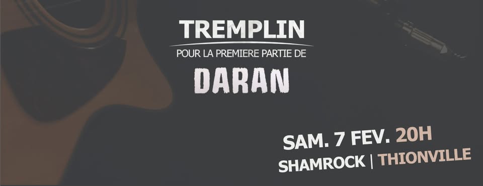 • 2026-02-07 20:00:00 2026-02-07 21:00:00 Europe/Paris Tremplin Première Partie de Daran Des compositions rock originales en français, interprétées en acoustique par 4 groupes bourrés de talent, de quoi passer une super soirée ! Venez écouter, soutenir et applaudir les 4 finalistes du tremplin "Première partie de Daran". 5, Rue de l'Ancien Hôtel de ville, 57100 Thionville, France Shamrock Pub Thionville
