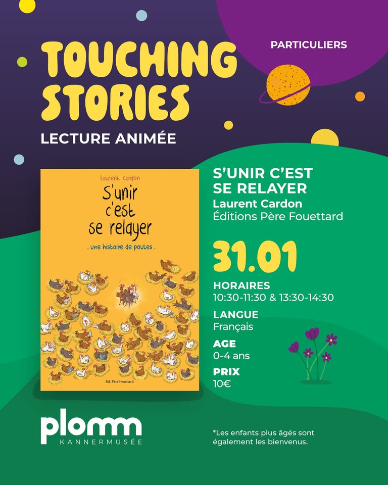 Les tout-petits de 0 à 4 ans partiront à la découverte d’une drôle d’histoire de poules qui expérimentent la démocratie, à travers le livre « S'unir c'est se relayer » de Laurent Cardon (Éditions Père Fouettard). La lecture sera interactive et suivie d’une activité créative guidée, en lien avec l’univers du livre.