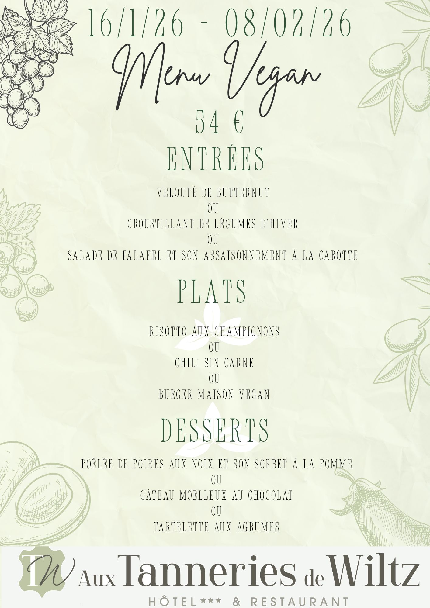 • 2026-01-20 12:00:00 2026-03-08 21:00:00 Europe/Paris Menu Végan spécial Du 16 janvier au 8 février, notre chef signe un menu végan élégant et gourmand. A découvrir dans notre restaurant à Wiltz, au coeur des Ardennes luxembourgeoises. Bon Appétit! 14 Am Bongert, Wiltz, Luxembourg Aux Tanneries de Wiltz (Hôtel & Restaurant)