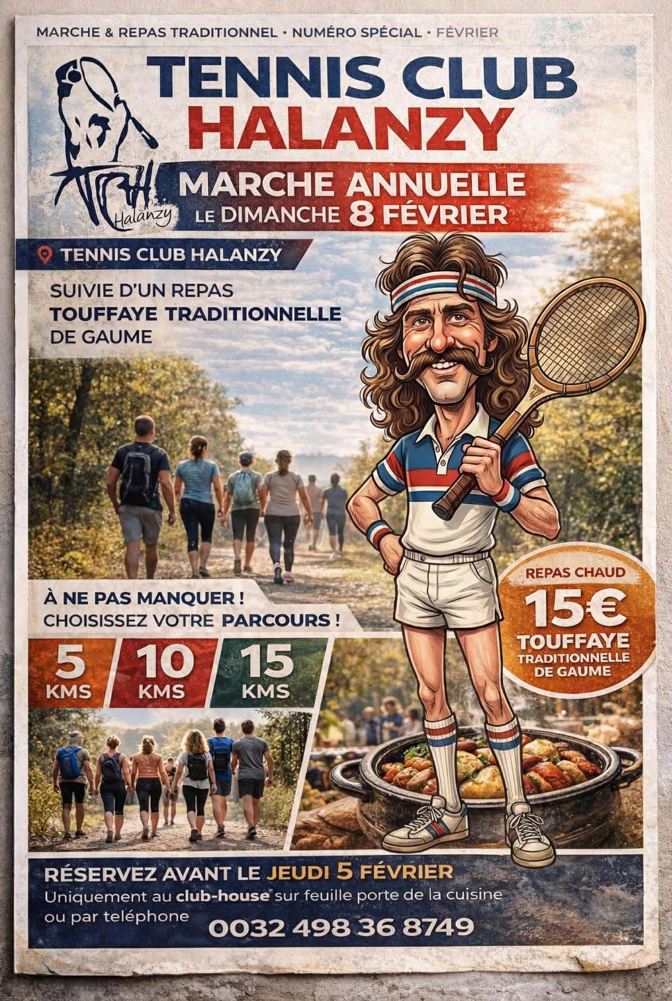 • 2026-02-08 2026-02-08 Europe/Paris Marche annuelle | Tennis Club Halanzy Le Tennis Club d’Halanzy vous invite à sa marche annuelle avec trois parcours au choix : 5 km, 10 km, ou 15 km. Venez nombreux ! Halanzy, 6792 Aubange, Belgique