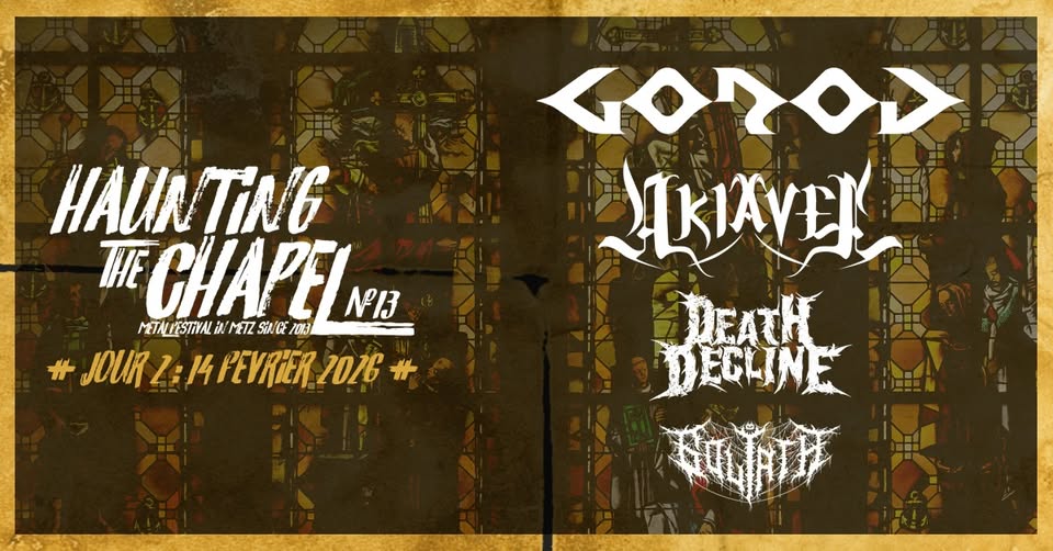 • 2026-02-14 19:00:00 2026-02-14 20:00:00 Europe/Paris Gorod & Guests I Les Trinitaires I Metz – HTC Festival #13 Damage Done Productions & Les Trinitaires présentent : Haunting the Chapel Fest 2026 x Jour 2 avec : Gorod, Akiavel, Death Decline et Goliath. Styles musicaux : death tech, death, thrash, deathcore. Les Trinitaires, 10\/12 rue des Trinitaires, 57000 Metz, France Cité musicale - Metz