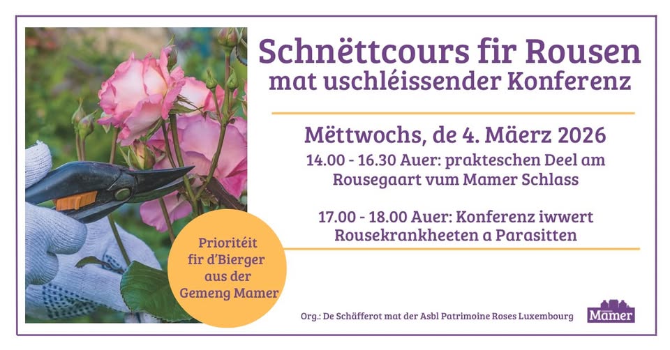 • 2026-03-04 14:00:00 2026-03-04 18:00:00 Europe/Paris Cours de taille de rosiers suivi d'une conférence Participez à un après-midi pratique et convivial autour de l'entretien des rosiers. Le cours sera animé par deux experts : Pierre Lauwers, jardinier et expert de la Ville du Roeulx (B), et Amandine Marinx, membre du jury du Royal Concours International de Roses Nouvelles du Roeulx (B). La conférence portera sur les maladies et les ravageurs des rosiers. 1, Place de l'Indépendance, 8252 Mamer, Luxembourg Gemeng Mamer
