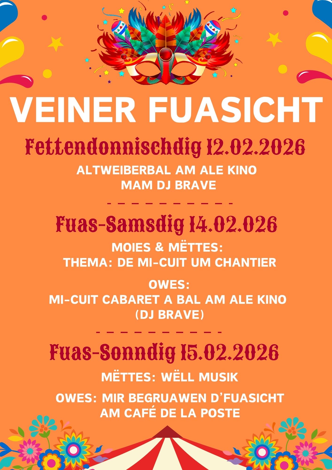 Les festivités débuteront le jeudi 12 février par une soirée à l'Ancien Cinéma de Vianden et se poursuivront jusqu'au dimanche. Organisé par l'association carnavalesque Mi-Cuits 75.