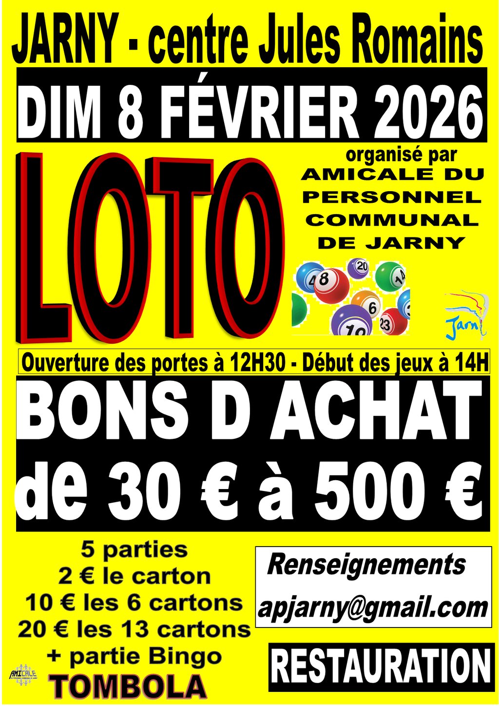 L'amicale du personnel communal de Jarny a le plaisir de vous convier à son grand loto. À la clé : des bons d’achat de 30€ à 500€. Il y aura également une tombola et de la restauration sur place. Venez jouer, tenter votre chance et passer un bon moment, seul, entre amis ou en famille.