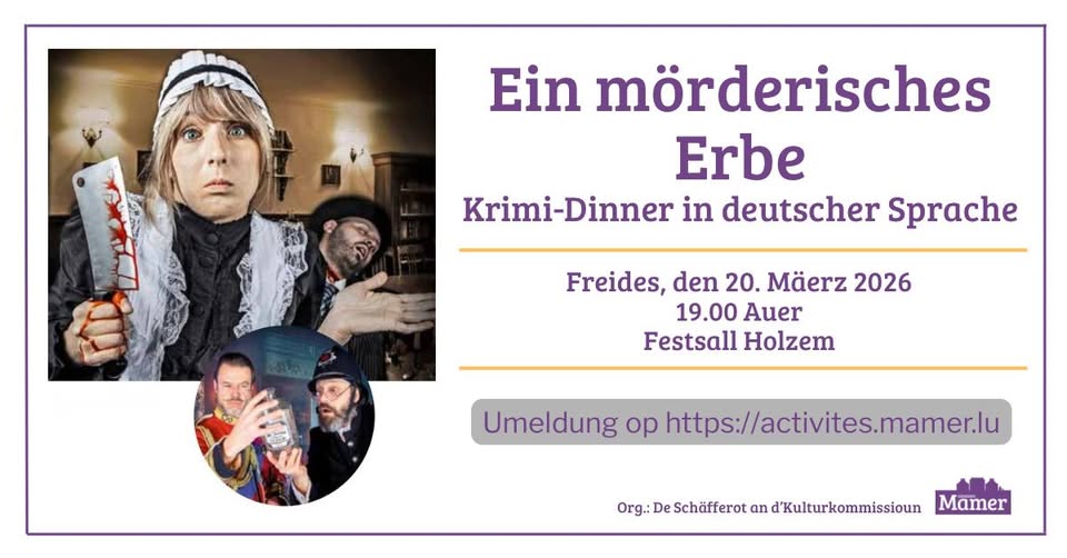 Paiement de la participation avant le 10 mars 2026 sur le compte communal LU21 0090 0000 3000 4634 (Raiffeisen), mention : Krimi Dinner.