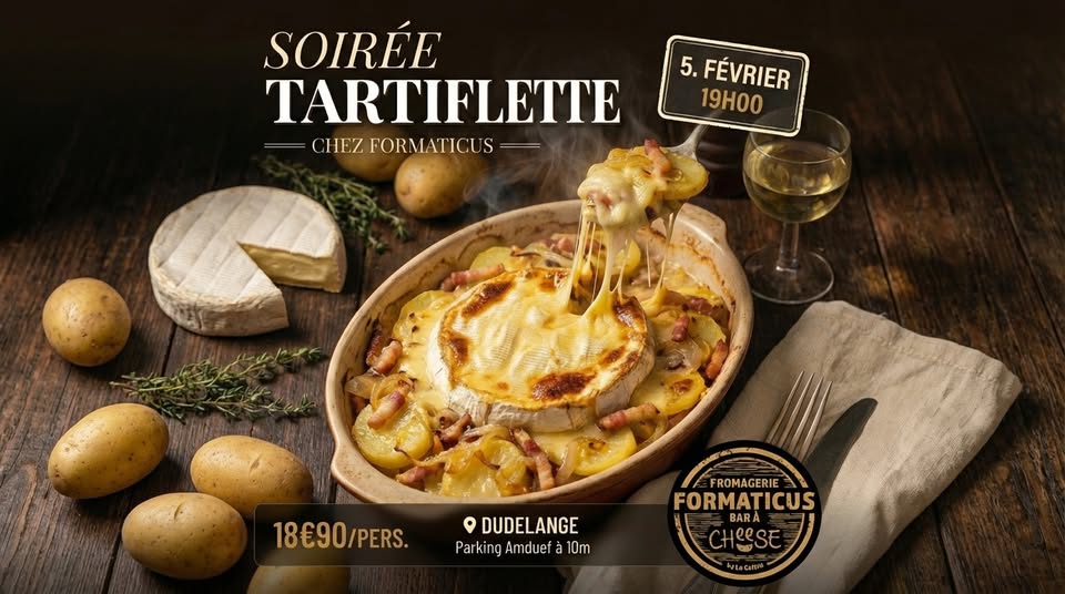 • 2026-02-05 19:00:00 2026-02-05 20:00:00 Europe/Paris Soirée Tartiflette – Reblochon Fermier chez Formaticus On réchauffe l'hiver avec un grand classique des Alpes : la tartiflette maison. Au programme : Un reblochon fermier fondant, sélectionné avec soin. Des pommes de terre dorées, des lardons croustillants, des oignons caramélisés. Le tout gratiné au four et servi dans une ambiance chaleureuse. Accompagnez le tout d'un verre de vin et passez une soirée conviviale entre amis, en couple ou en famille. Place Am Duerf 2 , L-3436 Dudelange, Luxembourg Kéis & Wäin by Formaticus & Domaine Vinsmoselle