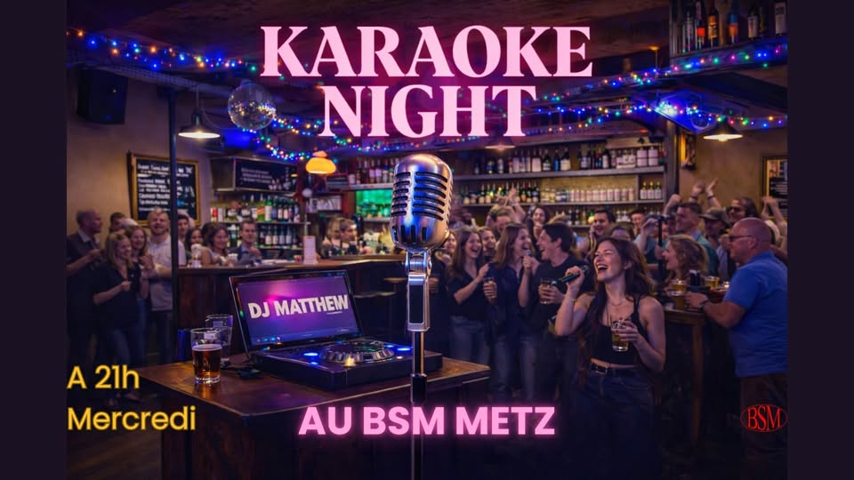 • 2026-02-25 20:30:00 2026-02-25 21:30:00 Europe/Paris Karaoké au BSM Metz Envie de chanter, de rire et de passer une soirée conviviale entre amis ? La Karaoké revient les mercredis au BSM Metz. DJ Matthew aux commandes pour te faire chanter les titres de ton choix. Que tu sois pro du micro ou simple amateur, l’ambiance est garantie ! Viens seul, entre amis ou en famille, et prends le micro. 2 bis à 4 2 B rue Sainte Marie, 57000 Metz, France BSM