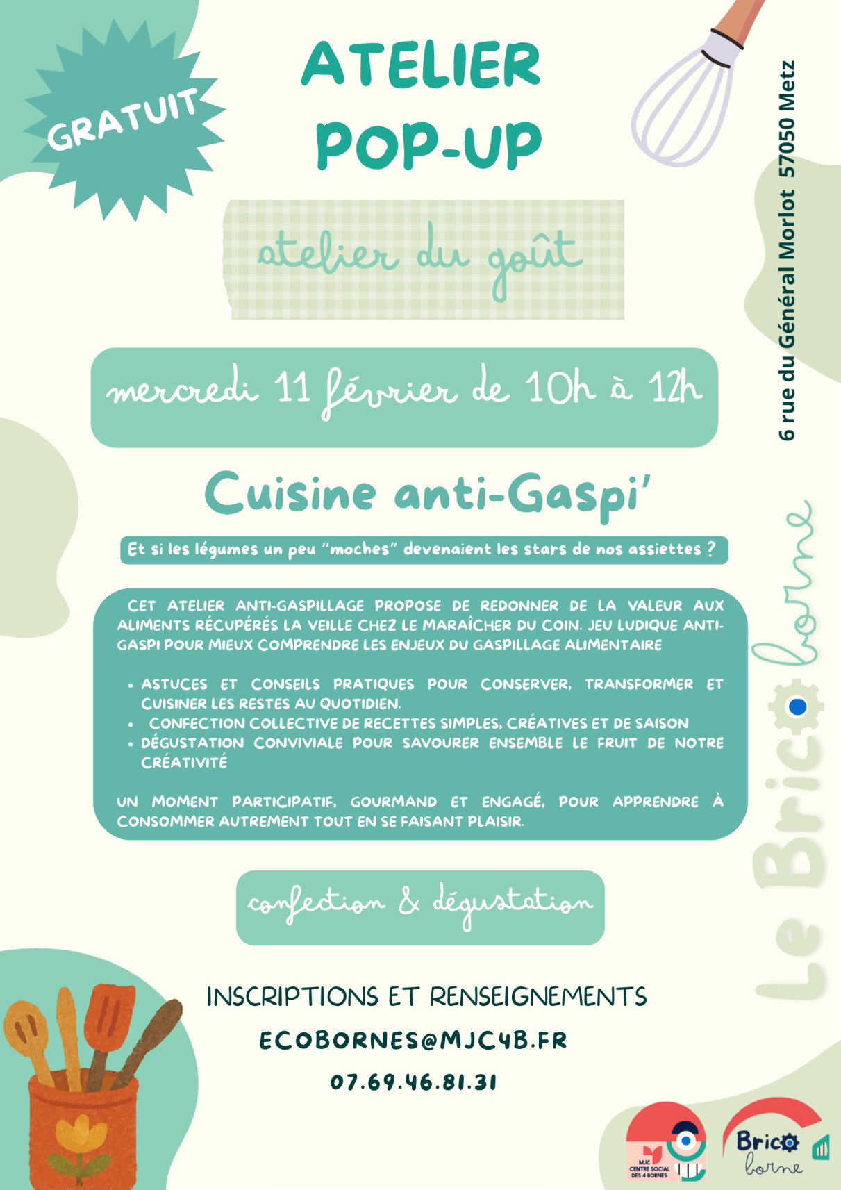 • 2026-02-11 10:00:00 2026-02-11 12:00:00 Europe/Paris Atelier du Goût La cuisine anti-gaspillage ! Venez improviser une recette grâce aux légumes récupérés chez le maraîcher du coin. 6 Rue du Général Morlot, 57050 Metz, France Tourisme Metz