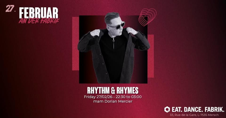 • 2026-02-27 22:30:00 2026-02-27 23:30:00 Europe/Paris Rhythm & Rhymes avec Dorian Mercier Venez profiter d'une soirée animée par Dorian Mercier sous le thème Rhythm & Rhymes. Fabrik Fabrik