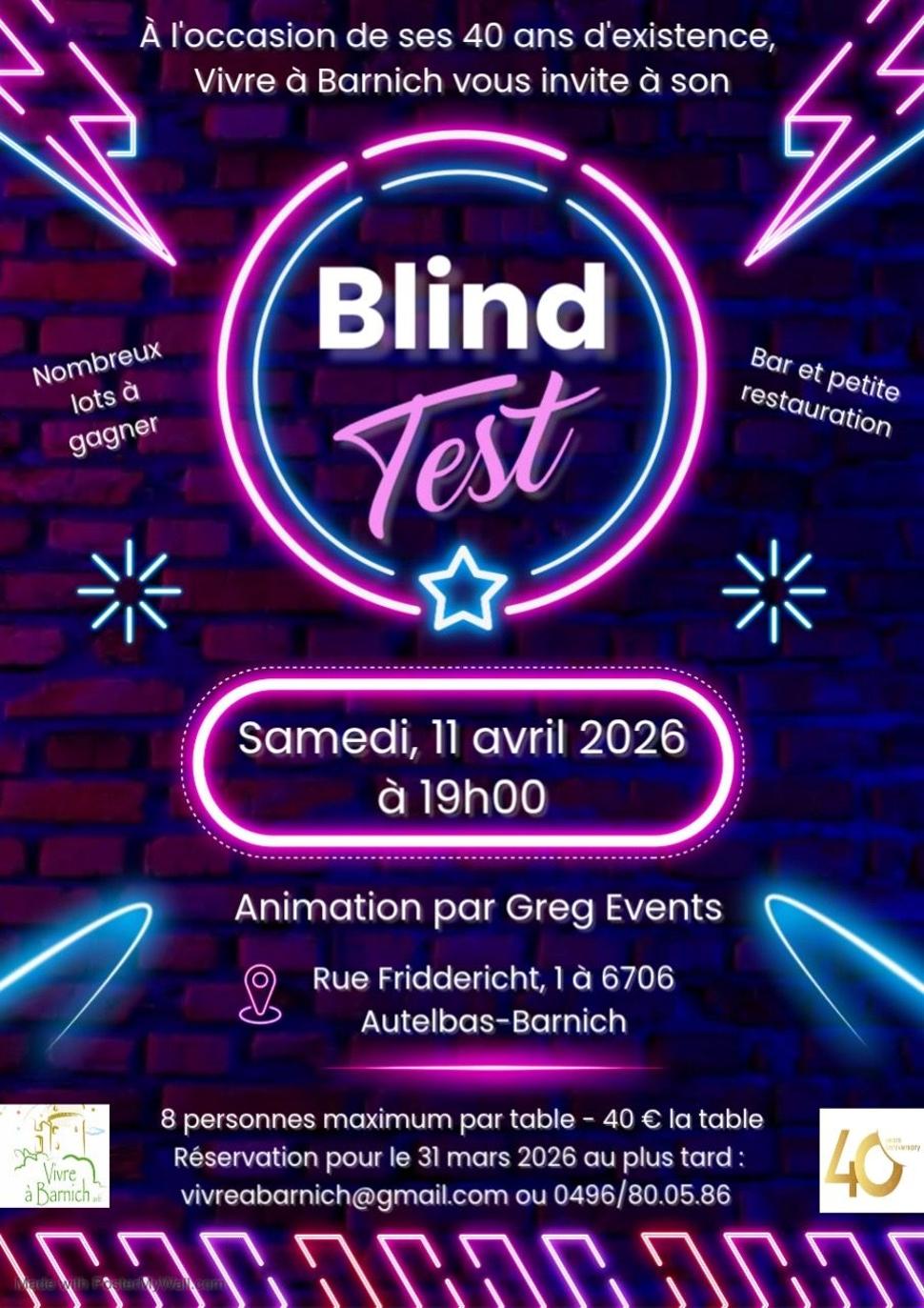 Vivre à Barnich vous invite à participer à une soirée Blind Test organisée à l’occasion de ses 40 ans d’existence. Venez tester vos connaissances musicales entre amis lors d’une animation assurée par Greg Events.