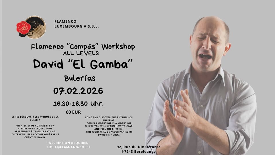 • 2026-02-07 16:30:00 2026-02-07 18:30:00 Europe/Paris Atelier de compás flamenco : tous niveaux : Bulerías avec David Moran El Gamba Venez découvrir les rythmes de la Bulería. Un atelier de compás est un atelier dans lequel vous apprendrez à taper le rythme. Ce travail sera accompagné par le chant de David. 92 rue du Dix Octobre Flamenco Luxembourg a.s.b.l